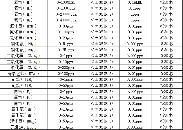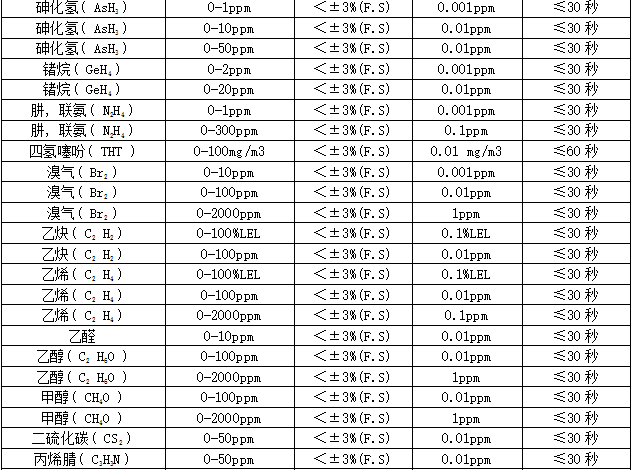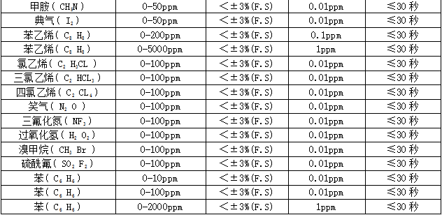 部分可檢測(cè)氣體列表: