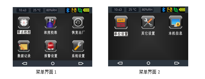 ●2.31寸高清彩屏顯示實(shí)時(shí)濃度、報(bào)警、時(shí)間、溫度、濕度、存儲(chǔ)、通信、電量、 充電狀態(tài)等信息,菜單界面采用高清仿真圖標(biāo)顯示各個(gè)菜單的功能名稱