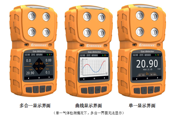 ●三種顯示模式可切換:同時(shí)顯示四種氣體濃度、大字體循環(huán)顯示單通道氣體的濃度、實(shí)時(shí)曲線,各通道之間自動(dòng)循環(huán)或手動(dòng)循環(huán)可切換,可設(shè)置是否顯示最大值、最小值、氣體名稱,可查看歷史記錄。